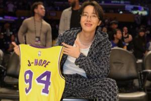 赛前,防弹少年团成员郑号锡手拿自己的94号湖人球衣现身场边。