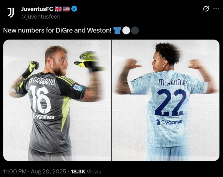 尤文图斯官方更新球员号码:迪格雷戈里奥改穿16号,麦肯尼接任22号