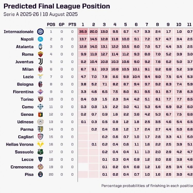数据机构发布新赛季意甲夺冠概率预测,国际米兰最被看好